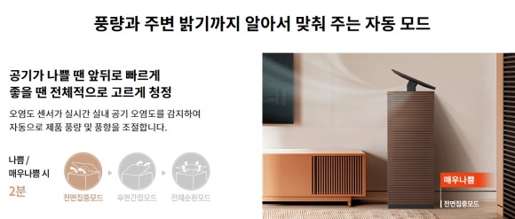 공기가 나쁠땐 앞뒤로 빠르게, 좋을땐 전체적으로 고르게 청정해줍니다.